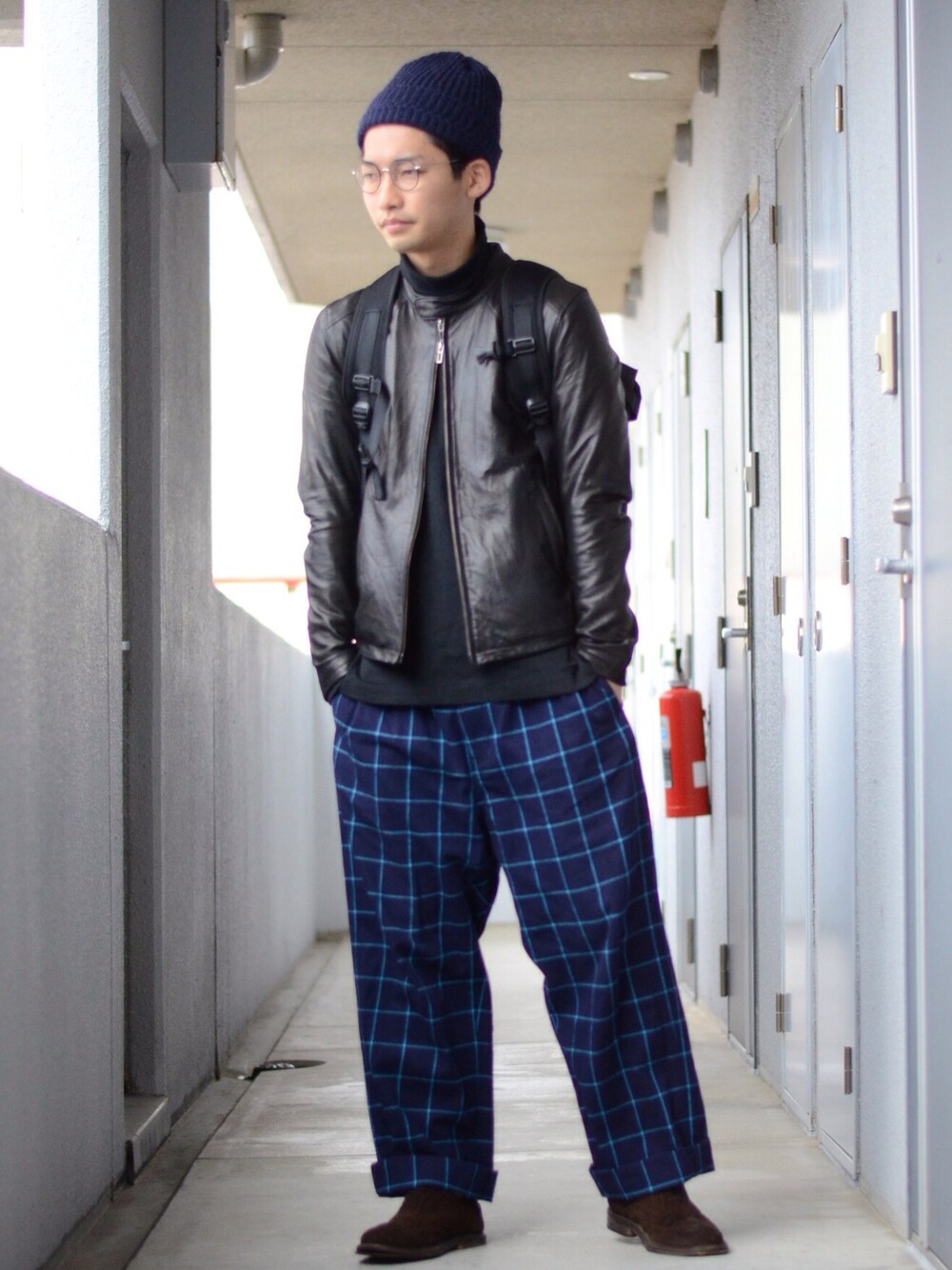 ニットキャップ/in cloudiness メガネ/Buddy Optical レザージャケット/DOMENICO+SAVIO タートルネック/UNIQLO パンツ/Name. このブランドのパンツは普段1を履きますが、これはあえて3を買いました。 極太具合がくせになってます。