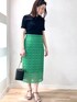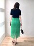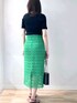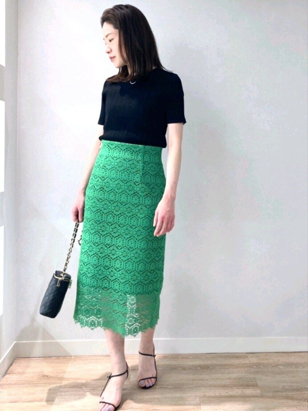 グリーン✕ブラックコーデ 《 手洗い可能》綿アセラメ ランダムリブプ ルオーバーニット ラメ入りで1枚着としても華やか ランダムリブタイプなので、 ボディラインも気になりにくく さらっとした着心地です。 《 手洗い可能》 クロッシェ タイルレースタイトスカート クロッシェ調のレースがオンオフ 着まわしやすいアイテム ハイウエストでヒップはゆったりめ のため窮屈感はなく、 すっきりスタイル アップ! レース部分の総丈が長めで 163cmの身長で膝下から透け感あり Iラインのすっきりコーデ