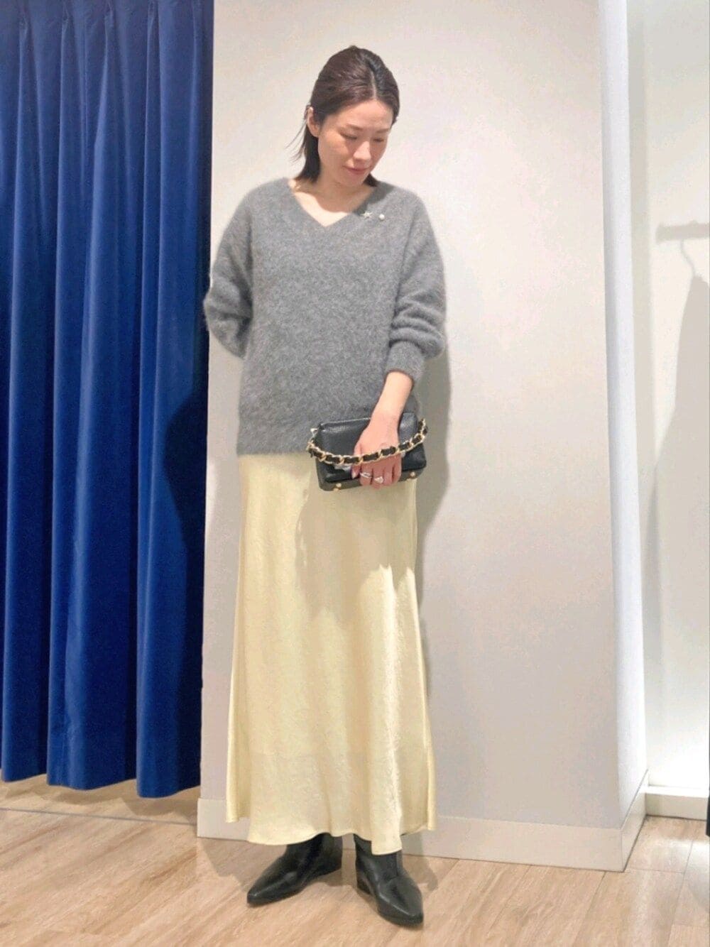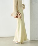ヘアリーニット☓ナロースカートコーデ ●カシミヤ混ヘアリー2WAYプルオーバーニット ヘアリーシリーズのプルオーバーニット ボートネック、Vネックデザインの前後 着用可能で 首まわり広めのあき具合 わたしはチクチク感なく、ゆったりめな シルエットで着やすい印象 裾のリブも緩やかで伸ばしたままでもOK ●ウォッシャブルブライトサテンナロースカート sophi定番マットサテンナロースカートの新型 ナチュラルなシワ感とツヤがあります マットサテンナロースカートより ウエストとヒップはゆるやかなサイジングで 吸い付くような感じもなく、 さらっと履きやすい。 同じサイズでもマットサテンナロースカートより ゆったりめなので、表面のシワ感もあって 見た目のフィット感が軽減される印象。 こちらも素材をバイアスで使用しているので 履き心地は良く、 シルエットもキレイなのがおすすめポイント