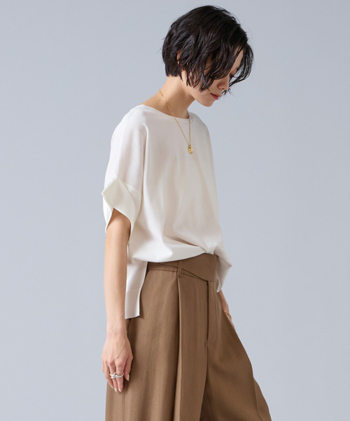 Liesseの定番人気、袖口サテンカフスプルオーバー。 【デザイン】 フロント・バックどちらでも着られる2WAYデザインで、 スタイリングの幅が広がる一枚です。 袖口には、A0166FP425のパンツと同素材のサテン生地を使用。 セットアップのように合わせれば、 統一感のある上品な着こなしが完成します。 シンプルさの中にさりげない華やかさがあり、 オン・オフ問わず活躍する万能プルオーバーです。 【素材】 綿×ポリエステルのさらりとした風合いの糸を、 ハイゲージで丁寧に編み立てたニット。 軽やかな肌触りで、季節を通して快適に着られる素材です。 袖口には、シルクのような上品な光沢とドレープ感が魅力の ヴィンテージサテンを使用。 異素材の組み合わせが、シンプルな中にもさりげない華やかさを添えています。 【お手入れ】 手洗い可能。 【コーディネートポイント】 ボトムを選ばずに、一枚で決まるプルオーバー。 スカートでもパンツでも、ウエストインでもアウトでもバランスよく装えます。 ********************** 透け感:ややあり 伸縮性:あり 光沢感:なし 裏地:なし 生地の厚さ:普通 **********************
