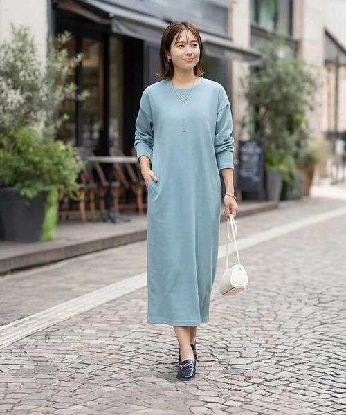 コットン95%にストレッチを加えたリブ素材を使用し、シンプルながら洗練された印象に仕上げたIラインのカットソーワンピース。適度な厚みと上品な質感で、カジュアルすぎず大人が着やすい一枚です。体のラインを拾いにくく、ストンとしたシルエットで自然に体型カバーも叶えます。 生地は表面に凹凸のあるさらりとした風合い、裏面はなめらかな肌当たりで着心地の良さも特徴。シワや劣化が起きにくく、季節を問わず着用できます。首元は詰まりすぎず程よい開きで、両サイドにはポケット付きです。 一枚でサマになるデザインで、ジャケットやシャツとのレイヤードも可能。きれいめからカジュアルまで幅広く対応でき、スニーカー合わせなどのラフな着こなしにも自然に馴染みます。 【その他の仕様などの情報】 ◆着用時期:夏以外 ◆サイズ感:ゆとりあり ◆丈感:足首を見せる丈感が基準 ◆シルエット:Iライン ◆首元:開きのあるクルーネック(鎖骨下3-4cmの開き加減) ◆肩幅:問わないタイプ(ドロップショルダー) ◆アームホール:広め ◆袖幅:広め ◆袖丈:長袖(手の甲が隠れる長さ) ◆袖口:何もなし ◆袖のたくし上げ:可能 ◆厚み:普通 ◆柔らかさ:ハリ感+着やすいしなやかさ ◆肌触り:表面はサッパリ/裏面はサラッとしてスムース ◆着用ジワ:できにくい ◆毛羽立ち:できにくい ◆伸縮性:あり ◆光沢感:なし ◆透け感:なし ◆スリット:なし ◆ボタンやファスナー:なし ◆ポケット:両サイドにあり ◆裏地:なし ◆手洗い:可能 ◆裾上げ:お直しに出していただけます ◆アイロン:不要 ◆スチーマー:使用OK 【お色について】 ◆ブラック:定番的な通常のブラックです。 ◆ライトブルー:ターコイズ系の明るいブルーです。
