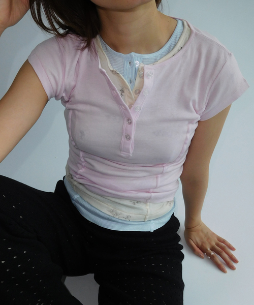 【26SS COLLECTION】 EDIT. FOR LULU 毎シーズンご好評いただいているコラボレーションが、今年も登場。 今回は、Millerで人気のシアー素材を使用し、LULUらしいバランスに落とし込んだ別注モデルを展開。 程よい透け感のあるライトなリブ生地は、やわらかく身体に馴染みながら、軽やかな着心地。 ラフなのに、どこか女性らしさを感じる1枚に仕上げました。 また、針抜き仕様の“パネルリブ”による、やわらかく伸縮性のある着心地も魅力のひとつ。 締めつけ感が少なく、長時間着ていてもストレスフリーに過ごせます。 トレンドのヘンリーネックT。 コンパクトなサイズ感に、肩まわりをすっきり見せてくれるフレンチスリーブ。 身体のラインをきれいに見せながら、抜け感のあるシルエットに仕上げています。フロントのボタンがほどよいアクセントになり、シンプルながらも1枚で様になるバランスに。 シアーな素材にのせることで、肌がほんのり透け、軽やかで女性らしい印象を引き立てます。 カラーは、今回のためにオリジナルで制作した花柄プリントと、ルルらしいやわらかなピンクと、爽やかな水色の細ボーダーの3色展開。 花柄プリントは、甘さの中にほんのりニュアンスを残した、大人が取り入れやすいデザインです。 ※取り扱いについては、商品についている品質表示でご確認ください。 ※照明の関係により、実際よりも色味が違って見える場合があります。 またパソコン・スマートフォンなどの環境により、若干製品と画像のカラーが異なる場合もございます。 ※商品の色味は、商品アップ画像をご参照ください。 <気になったアイテムは『お気に入り』がおすすめです!> お気に入り登録した商品の再入荷・在庫情報・値下げなどの通知を受け取ることができます。 本体:手洗い可能