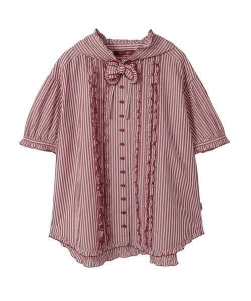 「さくらんぼの日曜日プリント」に描かれた、麦わら帽子に結んだストライプりぼんとお揃いのストライプのお洋服たち。 シロをベースにしたストライプが爽やかなフード付きブラウス。 上質な細番手の60/1コンパクト糸を使用したコットンブロード地。ソフト仕上げを施して上品な表面感と滑らかなタッチで仕上がった素材感はキレイめな仕上がりに。 フードまわりや、袖ぐち、裾まわりに、軽めのフリルで縁取りを入れて可愛らしい仕上がりに。 首もとには、まあるく実ったさくらんぼのような、ぽってりとしたピコフリルリボンをあしらってポイント使いに。 フロントまわりにもピコフリルをあしらてアクセントに。