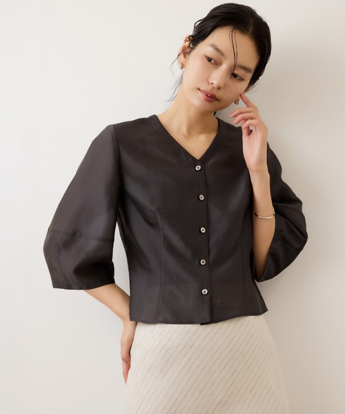 身体のラインを拾いすぎない絶妙なサイズ感が◎羽織りにもアレンジ可能な主役ブラウス 【デザイン・シルエット】 ランタンのような袖が印象的なシアーブラウス。 程よい透け感のあるオーガンジー素材が上品な抜け感を演出します。 コンパクトなシルエットながら、Vネックが顔まわりをすっきりと見せ、女性らしいラインを美しく引き立てます。 身体のラインを拾いすぎない絶妙なサイズ感で、リラックス感ときちんと感を両立。立体感のある袖デザインがフェミニンな印象を与え、気になる二の腕まわりもさりげなくカバーします。1枚で華やぎを纏える主役ブラウスです。 【おすすめのスタイリング】 シルエットを最大限活かすため、パンツ合わせのスタイルがおすすめです。 短丈デザインのため、インせずに着用してもバランスが取りやすく、自然とスタイルアップが叶います。 テーパードパンツできれいめに、ワイドパンツで抜け感のある着こなしにと、幅広いコーディネートに対応。フロントを開けて軽い羽織りとしても着用できるため、インナーとのレイヤードスタイルも楽しめます。ジャケットのインナーとしても活躍し、通勤からお出かけ着までシーズン問わず長く着回していただけます。 【素材】 超細番手のポリエステルと光沢のあるポリエステルを組み合わせた、シルクのような風合いが魅力のオーガンジー素材を使用。 軽やかで程よいハリ感があり、上品な透け感が女性らしい印象を高めます。 ---------------------------- 透け感:あり 裏地:なし 伸縮性:なし 光沢感:あり 生地の厚さ:薄手 ポケット:なし 開き方:ボタン 洗濯:弱洗濯機可能 ---------------------------- 【モデル情報】 モデル身長:175cm 着用サイズ:F ※画像の商品はサンプルです。実際の商品と仕様、加工、サイズが異なる場合がございます。 ※撮影場所やライティング、お使いのモニター環境によって色の見え方が異なる場合がございます。 ※商品のカラーは画像の色味をご参照ください。動画は仕様説明のため、色味が実物と異なる場合がございます。