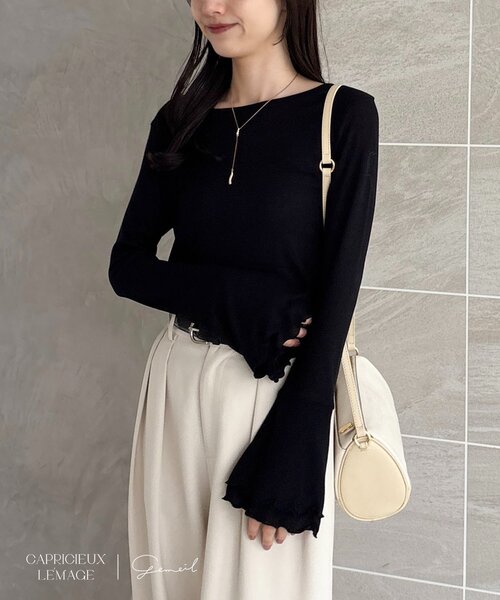 CAPRICIEUX LE'MAGE×gemeilコラボアイテム第2弾 4/2 12:00~発売スタート! 程よく透け感があり、首元後ろのコラボロゴがワンポイントに。 1枚で着てもお洒落見えする1枚です。 商品ポイント ・柔らかく伸縮性のあるリブロンT ・ティアードスリーブが可愛く、手元に動きが出るデザイン ・オートミール、ホワイト、ブラックの日常使いしやすい3色 ・首元後ろのコラボロゴがさりげないポイントに スタイリングポイント ・バブルバルーンキャミと合わせて大人可愛いスタイリングに ・カジュアルにデニムやワイドパンツ合わせも◎ ・春らしくフレアスカート合わせもおすすめ 【ホワイト着用アイテム①】切替コットンフレアスカート 【ホワイト着用アイテム②】スリットポケットストレートデニム 【ブラック着用アイテム】2タックワイドパンツ 【ベージュ着用アイテム】13ozハイウエストストレートデニム ********************** 透け感:ややあり 裏地:なし 伸縮性:あり 光沢感:なし ********************** ▼洗濯方法 手洗い可能 この製品は、刺繍が施されています。 ・洗濯や着用の際、引っ掛けにご注意ください。 ・刺繍部分への強い摩擦やもみ洗いはお避けください。 ・刺繍糸の色落ちによる色移りにご注意ください。 洗濯はドライクリーニングをお勧めしますが、手洗いの際は、次の点にご注意頂き、お取り扱い頂けます様、お願いいたします。 ※ネット使用、もしくは裏返してお洗い下さい。 ※この製品は、洗濯の際、多少の色落ちします。他のものと別に洗って下さい。 ※洗濯後は、製品を手の平、で軽く叩いてシワを伸ばし、型くずれしないように形を整えて日陰に干して下さい。 ※洗濯で若干縮みが生じることがございますのでご了承下さい。 ※撮影場所やお使いのモニター環境により若干お色味が異なる場合がございます。 特にロケの撮影では明るく見える傾向にございます。 ※商品はサンプルで撮影をしております。若干の仕様が変更になる場合がございますので予めご了承の上ご注文くださいますようお願いいたします。 ▼商品のお気に入り登録 完売カラーの再入荷通知や、ラスト1点の通知、セールの通知も受け取ることができます。 ▼ブランドのお気に入り登録 新商品や再入荷など、いち早くブランドのお得な情報を受け取ることができます。