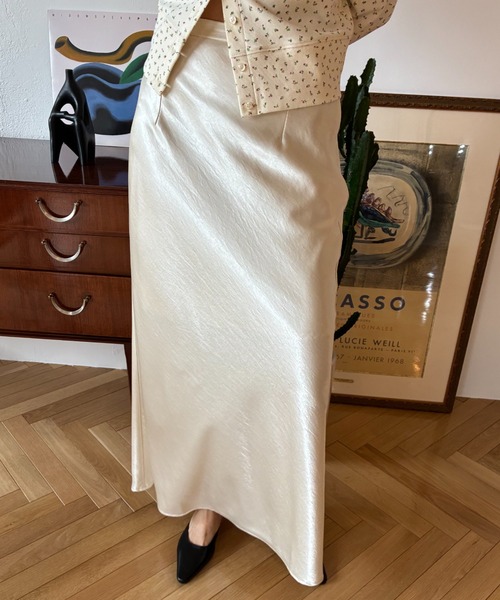 〈 Design Point 〉 落ち感のあるサテンが描く、しなやかなマーメイドシルエット。 動くたびにさりげなく揺れる光沢が、洗練された印象を引き立てます。 バイアスカットによって生まれる自然なフィット感が、身体のラインを美しく見せつつ、無理のない着心地に。 ウエストはフロントをミニマルに、バックのみゴム仕様にすることで、見た目の美しさと快適さを両立。 カラーは、やわらかなニュアンスを添えるアイボリーと、スタイルを引き締めるブラックの2色展開。 スタイリングに取り入れるだけで、さりげなく女性らしさと品を引き出してくれる一枚です。 〈 Styling 〉 コンパクトなトップスを合わせて、シルエットを引き立てて。 シアートップスやレースアイテムと合わせれば、よりフェミニンな印象に。 Tシャツやタンクトップで抜け感を出した、カジュアルミックスもおすすめです。 〈 Size 〉 FREE サイズ 〈 Detail 〉 ポリエステル100% 透け感:なし 伸縮性:ややあり 裏地:あり ・濃色品は着用や摩擦(特に濡れた状態)により、下着やベルトなどの(特に淡い色の)他の衣類に色が付着することがありますのでご注意ください。 ・洗濯、クリーニングの際、他の物と一緒に洗わないで下さい。また、つまみ洗いはお避けください。 ・濡れた状態での長時間の放置や、付け置き洗いは厳禁です。水に付け置くことにより染料が流出しやすくなり、色落ち、色移り、色泣きの原因となります。 ・濃色品は、漂白剤入りの潜在を使用しないで下さい。 〈 FUULLY STUDIO 〉 -フーリィースタジオ- 「そぎ落としたクラシックをベースにフェミニンさとユーモアさの遊び心あるアクセントを加えた洋服で、 あなたを満たす一枚」をテーマに、キュートで愛おしさを表現する柄やカラー、シルエットを落とし込んだ洋服を提案するレディースブランド。 クラシカルでベーシックなアイテムとフェミニンなアイテムを融合させたスタイリングで、凛とした女性の中の愛おしさを表現しています。 〈 公式Instagram 〉 @FUULLY_STUDIO 新作アイテムの情報やおすすめ商品を随時UPしております。 是非チェックしてみて下さい。 ---------------------------------------------------- 〈 お買い物をよりお楽しみいただく為に 〉 ・商品のお気に入り登録 ♡をクリックして気になるアイテムをお気に入りに登録していただくと 完売カラーの再入荷や、ラスト1点の通知、セールの際の通知を受ける事ができます。 ブランドのお気に入り登録もご一緒にお願い致します。 ※ご注文いただいた予約商品のお届け時期の確認は、注文履歴ページより行えます。