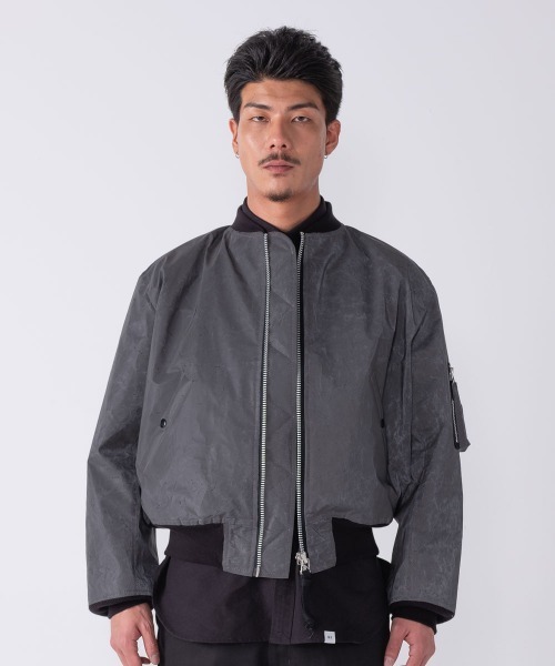 ポリエステルとレーヨンの混紡タフタに、反射剤を含んだ黒色を前面にプリントした特殊な素材を表側に採用。裏側にはスカジャンなどに使用される中肉の光沢のあるサテン生地を採用。本体に中わたを入れることで防寒性を確保。身幅を広くし、あえて極端に着丈を短めにすることで独特のフォルムを表現。表側は反射性があるので、暗闇の中で光に反応する特殊効果が特徴。 ※商品と袋がくっつかないように製品袋内に粉末が微量に入っておりますが、商品の品質を正常に保つために使用しております。 特に黒い製品にはその粉末が折り目等に目立って汚れのように見えてしまうことがございますが、製品上問題はございませんのであらかじめご了承をお願い致します。 気になるようでしたら、濡れ布巾等で拭き取っていただければ簡単に落ちるものとなっております。