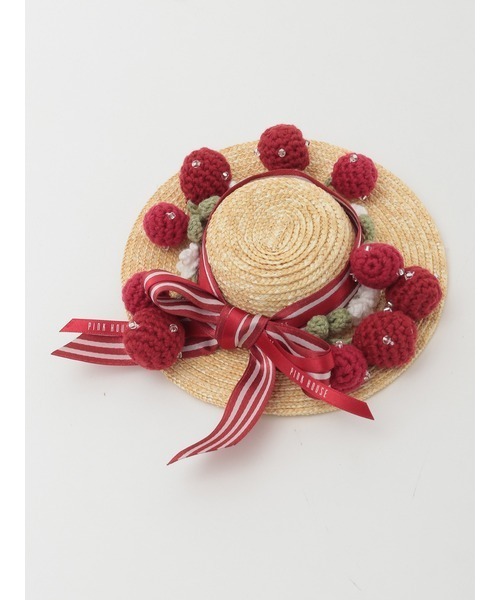 さくらんぼの日曜日~sunday of she cherries~ わたしのお家はさくらんぼ農園。 カーテンを開いてやさしい日曜日が迎えにきた。今がいちばん好きな季節。 木陰の下で頑張るさくらんぼ。麦わら帽子のストライプのりぼんが風に揺れる午後。 収穫できないさくらんぼたちは捨てないの。お気に入りの麦わら帽子に飾り付けるのよ。わたしだけの素敵な帽子。 陽光が微笑む日曜日のようなリズミカルな「さくらんぼの日曜日プリント」 プリントに描かれた、ストライプのりぼんやさくらんぼで飾りたてたキュートで華やかな麦わら帽子をモチーフにして素敵なコサージュにしました。 ころんと丸みを帯びたさくらんぼのニットモチーフをぐるりいっぱいに飾り立てて、やや太めの幅のアカ×シロのストライプリボンで可愛く結びました。さらにアカ×シロの細幅のサテンリボンも挟み込んでアクセントに。 真っ赤なさくらんぼのモチーフのほかにも、真っ白な花やグリーンの葉っぱも織り交ぜて華やかに仕上げました。つややかなさくらんぼの実を表現するべく、真っ赤なモチーフにはクリアビーズを散りばめています。 麦わら帽子もカンカン帽子のように平べったいクラウンになるように意識しながら、1つ1つ手作業で作成しております。 そんなこだわりの詰まったキュートで豪華なコサージュは、付けるだけでコーディネイトが華やぎます。