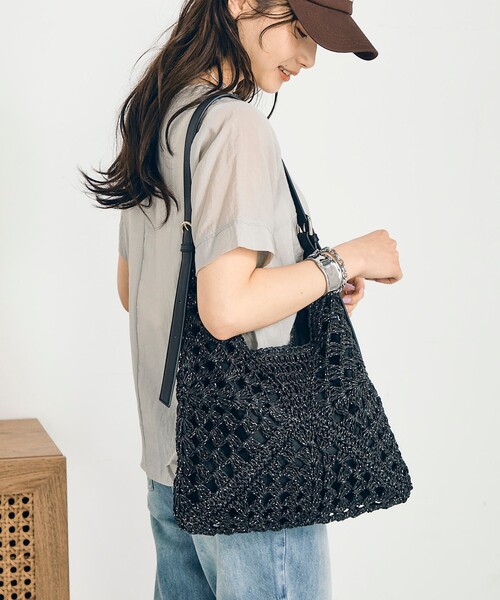 ◇fredy emue◇ 【2026 SS】 さりげないラメ感が魅力のワンショルバッグ ●point ・ラメ糸を織り込んだ透かし柄が印象的なワンショルダーバッグ ・さりげない輝きがコーディネートに華やかさをプラス ・透かし編みデザインで軽やかな雰囲気に ・ショルダーの長さを調節でき、肩掛け・斜め掛けの2WAYで使用可能 ・春夏のスタイリングに季節感を添えてくれるバッグです 《収納の目安》 ・A5サイズファイル ・折り畳み傘 ・長財布 ・ポーチ ・スマートフォン ◇商品のお気に入り登録◇ 【お気に入りに登録】を是非ご活用ください。 再入荷の通知がいち早く届きます。 ●お取扱い上のご注意● *アテンションタグを必ずご確認の上、着用又はお取り扱い下さい。 *店頭及び屋外での撮影画像は、光の当たり具合で色味が違って見える場合があります。商品の色味は、スタジオ撮影の画像をご参照下さい。 *商品画像に関しては出来る限り忠実に表示出来るよう努めておりますが、お客様がご利用のモニターの設定及び特性により、実際の商品と比較し色味に若干の誤差が生じる場合があります。 *生地の特性上、やや匂いが強く感じられるものもございますので予めご了承下さい。 *濃色製品のため、水や摩擦により色落ち・色移りする場合があります。衣類等との接触や密着・密閉状態での使用・保管にはご注意ください。 ※サンプルでの採寸のため、サイズ表はあくまで目安となります。予めご了承ください。