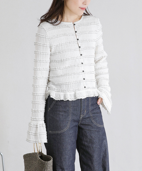 先方品番: M261-83022 ※サイズについて 弊社販売サイズ:メーカーサイズ フリー:F ※カラーについて 弊社販売カラー:メーカーカラー ホワイト(010):0/WHITE 【2026SS】 LaTotalite ご好評につき完売していたカーディガンが追加決定! 「小さなフリルが連なる、甘さをひとさじ。」 段になったミニフリルが愛らしい表情をつくる、Mewlらしい大人可愛いカーディガン。 裾にもミニフリルを添えて、華やかさの中に上品な遊び心をプラス。 前後2WAY仕様で着回し力も抜群。 カーディガンとしても、プルオーバーとしても楽しめる春の気分を軽やかに運ぶ一枚です。 【 Mewl / ミュール 】 大人のためのかわいい服。 好きなものをあきらめない。アレもコレもゆずれない。 年齢を重ねるにつれ貪欲になっていく心。 いつまでもかわいくいたいけれど、かわいいだけじゃイヤ。 そんなワガママをかなえる服を作りました。 かわいくて、強くて、繊細。 すべてのワガママな女性へ届きますように。 ※取り扱いについては、商品についている品質表示でご確認ください。 ※照明の関係により、実際よりも色味が違って見える場合があります。 またパソコン・スマートフォンなどの環境により、若干製品と画像のカラーが異なる場合もございます。 ※商品の色味は、商品アップ画像をご参照ください。 着用モデル身長:164 着用サイズ:フリー モデルサイズ:身長:163cm 着用サイズ:フリー 本体:手洗い可能
