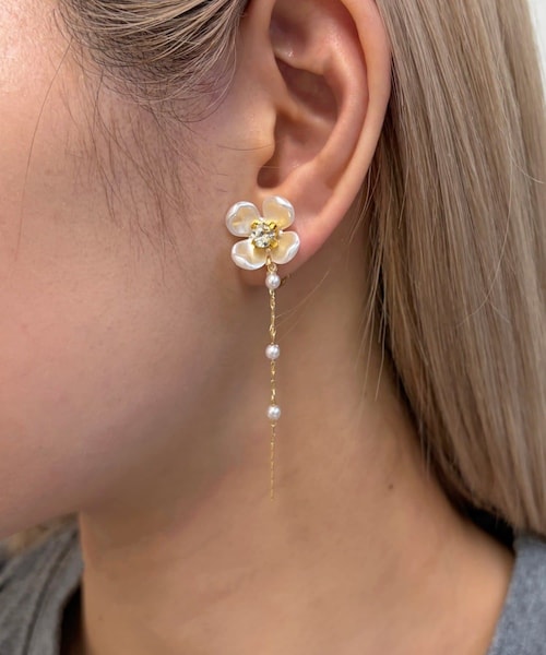 顔周りをパッと華やかに彩る、フラワーモチーフのイヤリングが登場ぷっくりと立体感のある乳白色のお花が、とってもキュートなデザインです。中心でキラリと光るビジューと、お花の下でゆらゆら揺れるロングチェーンが女性らしさを引き立てます。チェーンにあしらわれた小粒のパールが、上品で繊細な雰囲気をプラス。動くたびに耳元で揺れるデザインは、周りの視線を集めること間違いなし。縦長のシルエットで、すっきり見えが叶うのも嬉しいポイントです。シンプルなTシャツやブラウスに合わせるだけで、いつものコーデをぐっと格上げ。ワンピースやドレスと合わせれば、結婚式やパーティーなどのオケージョンシーンにも大活躍します。つけるだけで気分が高まる、とっておきのアクセサリーです。