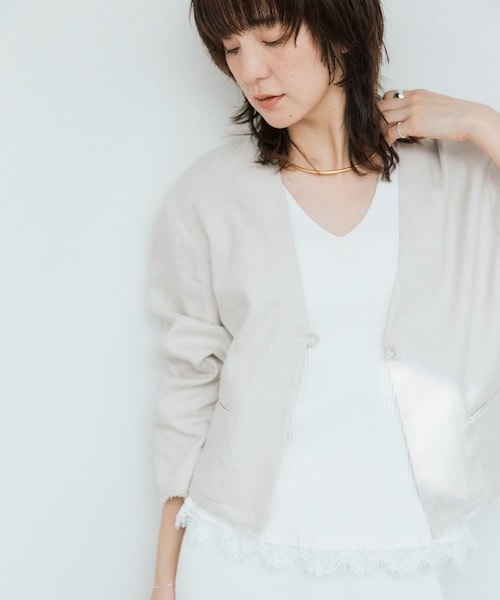 「品の良さ」と「カジュアルな抜け感」を両立●デザイン・1枚仕立てのボクシーなショート丈ジャケット。ノーカラーデザインでカーディガン感覚で軽く羽織れるアイテムです。・素材はリネンと和紙を組み合わせたヘリンボンをセレクト。ナチュラルなリネンの質感と和紙独特の軽さ・通気性の良さが魅力です。・シンプルなデザインながらチャイナボタンとフリンジで個性もプラス。品の良さの中にカジュアルな外しを効かせ、大人のデザインに仕立てました。・程よくドロップさせたショルダーラインでボディと袖のゆとりがあり、風通しがよく涼しく着用いただけます。・レースヘムスリーブレスニット(RDZ1061405A0006)とお召しいただくのもバランスが良くおすすめです。●素材リネン 58% 分類外繊維(紙) 26% ポリエステル 16%・リネンと和紙糸を組み合わせたヘリンボン素材洗濯方法:ドライクリーニング透け感:なし裏地:なし伸縮性:ややあり光沢:なしファスナー:なしポケット:あり--------------------------------------------------------------------------------【お買い物をもっと便利に楽しく♪】『♡』をクリックでお気に入り登録✓「商品のお気に入り登録」で・・・ラスト1点や再入荷の通知が届きます。登録して頂いた商品だけが対象となる、あなただけのタイムセールが開催されることも!✓「ブランドのお気に入り登録」で・・・新商品や再入荷など、いち早くブランドのお得な情報を受け取ることができますので、ご登録をおすすめします!--------------------------------------------------------------------------------【注意点】※画像の商品は光の照射や角度、お使いのモニター環境により、 実物と色味が異なる場合がございます。※入荷状況により、お届け予定が前後する場合があります。※お客様への発送が店頭販売より遅れる場合もあります。※追加生産商品は、一部の店舗、通販で販売中の場合がございます。 予めご了承下さい。----------------------------------------------------------------------