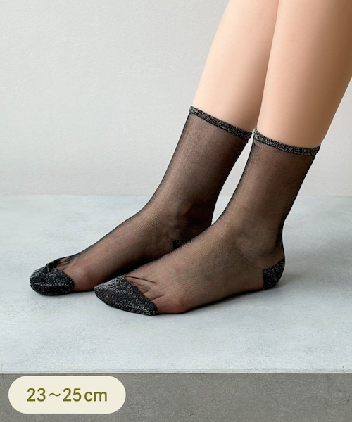 ●キラキラとした上品なラメがポイントのシアーソックスです。●シアー素材でさりげなく足元に抜け感を◎●合わせやすいクルー丈で、パンプスやスニーカーなど様々なシューズに合わせていただけます。《ご使用上の注意》●繊細な編み方になっております。台紙を抜かれる際と、ご着用の際は爪などで引っ掛けないようご注意ください。●この素材は摩擦(特に湿った状態での摩擦)や、汗や雨などで濡れた際、他の衣料や下着に色が移ることがありますので、ご注意ください。●濡れたまま放置しないでください。●伸縮性に富み、フィット性に優れた糸を使用している為、左右の寸法が異なる場合がありますが、充分伸びますので着用上問題はありません。●ラメを使用している商品は肌に刺激を与える可能性があります。着用中に赤み、かゆみ等があらわれた場合には、すぐにご使用をおやめください。
