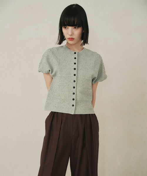 さりげないラメを効かせたパフ袖カーディガン ■デザイン もちっとしたラメ混の編み地で作るパフ袖のフォルムが特徴的なトップス。 かま底を深めに、袖ぐりを内側に入れて、身頃をコンパクトな見え方にすることですっきり着られるフォルムに仕上げました。 フロントに効かせた配色ボタンもポイントです。 ■素材 さりげないラメ混の糸で梨地風のジャガード編みにしています。 もちっとした膨らみと独特な表情感が魅力。 辛口に着こなせるブラウンとニュアンシーなライム、ライラックのカラーも素敵です。 ■コーディネート カジュアルにもきれいめにも合わせやすいです。 辛めなボトム×サンダル合わせでモードなスタイルがおすすめ◎ #春服,#春物,#夏服,#夏物,#26SS,#半袖,#ショートスリーブ,#羽織,#カーディガン ============================ 裏地:なし 透け感:なし 伸縮:あり 光沢感:あり ケア方法:手洗い可 ============================ < EMMEL REFINES(エメル リファインズ) > Pleasure ~今を楽しみ、変化を楽しむ~ EMMEL REFINESは変化していく時代やトレンドを恐れなく前向きに楽しみ、 今に満足せず常に自分を更新していきたい、 自分らしさを表現したい女性に向けたブランドです。 女性の共感を大切に、時代にフィットした新しいスタイルを提案します。 【注意事項】 ※画像の商品はサンプルです。実際の商品と色味、仕様、加工、サイズ、素材等が若干異なる場合がございます。 ※工場の生産の都合上、納期が変更になる場合がございます。発送日の前後についてはあらかじめご了承ください。 ※入荷状況により、お客様への発送が店頭販売より遅れる場合もございます。 ※商品に「取り扱い上の注意書き」、「洗濯表示」がございます場合は、使用前に必ずご確認ください。 ※商品画像は、光の当たり具合やパソコンなどの閲覧環境により、実際の色味と異なって見える場合がございます。あらかじめご了承ください。 ※商品の色味の目安は、商品単体の画像をご参照ください。 お問い合わせの際は、ユナイテッドアローズ カスタマーサービスデスクまで下記の品名/品番をお申し付けください。 品名:EM JQD パフSL PO&CD 品番:66181000006