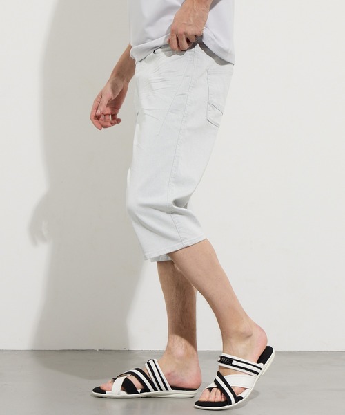 ■デザイン ストレッチ性に優れたデザインクロップドパンツです。 ウエストベルトの地の目を変える事で、ベルト部分も伸縮する様にしております。 ■サイズ 細身のサイズ感で裾に向かってテーパードさせたすっきりとしたシルエットに仕上げています。 ■素材 09(オフ)はヨコ糸に黒色の糸を使用して奥行のある色目を表現したストレッチサテン素材、60(ブルー)/67(インディゴ)には10ozのストレッチデニム素材を使用。 両素材共に非常に良く伸び、キックバックもしっかり効いたストレスフリーな穿き心地が魅力です。 伸縮性:あり 生地の厚さ:普通 裏地:なし 加工:製品ユーズド加工 ■注意点 60(ブルー)・67(インディゴ)=インディゴ染めのデニム素材になります。 色落ちし、褪せてきます。 素材の特性としてご了承の上、ご注意下さい。 それと強い光には当てない、当たらない様に取り扱いに気を付けて下さい。 ※画像の商品はサンプルです。 実際の商品とは仕様・加工・サイズ・素材が若干異なる場合がございます。 ※掲載画像の商品の色味は、撮影場所や光の当たり具合などにより色味が異なって見える場合がございます。 商品の色味は、生地アップの画像をご参照ください。 また、お客様のお使いのPC・スマートフォン等のモニター環境などにより色味が異なって見える場合がございます。 予めご了承の上ご注文ください。 ※着用モデル身長182cm B89cm W75cm H90cm 着用サイズ48