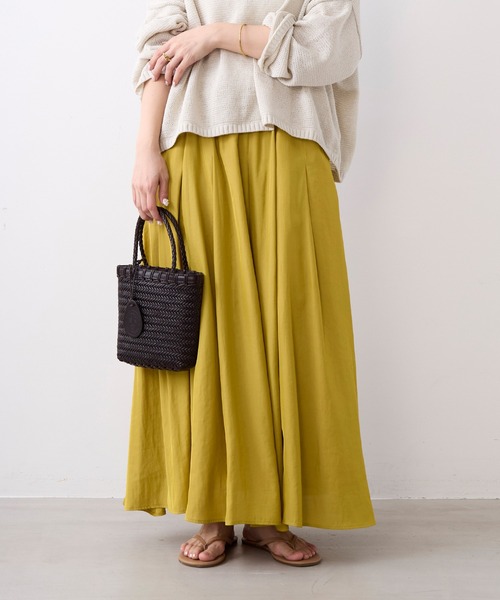 歩くたびに揺れるフレアがきれいなスカート。 毎年人気のギャザースカート。 今年はヴィンテージのような鈍い光が特徴の生地を使用しています。 分量のあるタックギャザーですが、落ち感がある素材を使用することで腰回りからの広がりを気にせずご着用いただけます。 ヴィンテージのような鈍い光が特徴の生地を使用することで甘くなりすぎず、上品な印象のスカートです。 【fabric】 シルクのような軋みと上品な光沢感を持つ糸で織り上げられた割線生地です。 ギャザーの分量感がありながらも、軽やかな素材を使用しています。 -------------------------------------- 透け感:なし 裏地:あり 伸縮性:なし 光沢感:ややあり 生地の厚さ:やや薄手 ポケット:あり --------------------------------------水洗い可 *詳しくは商品の洗濯表示にてご確認をお願い致します。 【coordinate】 イージーな穿き心地ながらもきちんと感があるのでオンオフで活躍してくれます。 Tシャツを合わせてカジュアルダウンさせた着こなしも、ルーズなニットを合わせたリラックススタイルもおすすめです。 ※こちらの商品は独特な風合いを出すため、生地に特殊な加工を施しております。 そのため一点一点風合いが異なりますが、生地の特性になりますのでご了承ください。 ※こちらの商品はとてもソフトな素材を使用している為、摩擦や引っ掛け、極度な伸ばし及び引っ張り(脱衣時、洗濯時のからみ等)はお避け下さい。 ※商品画像はできる限り実物の色に近づけるよう徹底しておりますが、お使いのデバイスのモニター設定、お部屋の照明等の閲覧環境により実際の色味と異なって見える場合がございます。 ※画像の商品はサンプルです。実際の商品と仕様、加工が若干異なる場合があります。予めご了承くださいませ。 ▼商品のお気に入り登録 お気に入りアイテムの値下げ・再入荷・在庫1点などの通知を受け取ることができます。 ▼ブランドのお気に入り登録 新商品や再入荷、クーポン配布などのお得な情報を受け取ることができます。