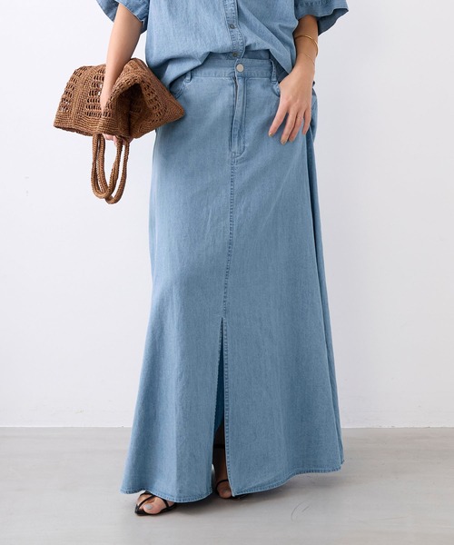 5.5ozのコットンリネンデニムを使用したデニムスカートです。 フレアが入ったシルエットですが腰回りがスッキリ見えるようにし、大人っぽいシルエットになるように工夫しています。 【fabric】 薄くて軽い5.5ozのライトオンスデニム素材です。 リネンが入っているので綿100%に比べて軽く、少しシャリみがあるのが特徴です。 酷暑が続く季節でも涼しくご着用いただけます。 -------------------------------------- 透け感:なし 裏地:なし 伸縮性:なし 光沢感:なし 生地の厚さ:やや薄手 ポケット:あり --------------------------------------水洗い可 *詳しくは商品の洗濯表示にてご確認をお願い致します。 【coordinate】 軽やかな穿き心地のデニム素材なので、暑い時期にも涼しくスタイリングしていただけます。 同素材のブラウスとのセットアップスタイルもおすすめです。 【staff comment】 《スタッフ:158cm》 着用サイズ:36/普段サイズ:36/S~M ウエストはややゆとりがあり、リラックス感のある着心地です。 丈感もしっかりあり、今っぽいバランスで着用できます。 《スタッフ:168cm》 着用サイズ:38/普段サイズ:38/M~L ウエストは36サイズでも問題なく着用できましたが、長めの丈で穿きたかったため38サイズを選びました。 カジュアルすぎず、きれいめにも合わせやすい一枚です。 こちらの商品はセットアップとしてもお楽しみいただけます。 ドルマンスリーブデニムブラウス/0126201117 こちらの商品は同素材でワンピースも展開しています。 スキッパーデニムワンピース/0126204119 ※商品画像はできる限り実物の色に近づけるよう徹底しておりますが、お使いのデバイスのモニター設定、お部屋の照明等の閲覧環境により実際の色味と異なって見える場合がございます。 ※画像の商品はサンプルです。実際の商品と仕様、加工が若干異なる場合があります。予めご了承くださいませ。 ▼商品のお気に入り登録 お気に入りアイテムの値下げ・再入荷・在庫1点などの通知を受け取ることができます。 ▼ブランドのお気に入り登録 新商品や再入荷、クーポン配布などのお得な情報を受け取ることができます。