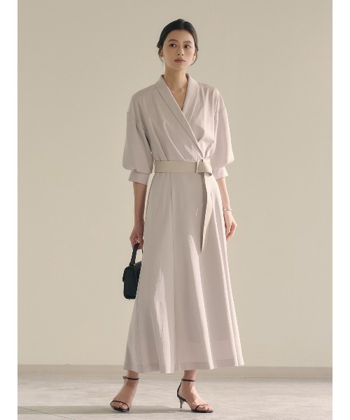 構築的なシルエットが際立つ、モードとエレガンスを併せ持つロングワンピース ■ Design 深めに重ねたカシュクールデザインがデコルテを美しく引き立て、顔まわりに洗練された印象を与えます。 ウエスト位置を高めに設定することで自然と縦のラインが強調され、スタイルアップ効果も期待できる1枚です。 スカート部分は程良い分量感を持たせたフレアシルエットに。 歩く度にしなやかに揺れ、女性らしい動きを演出し、凛とした大人の雰囲気を纏えるのが魅力です。 付属のフェイクレザーベルトを合わせることで、ウエストラインにメリハリをプラス。 コーディネート全体を引き締め、よりモードで完成度の高いスタイリングが叶います。 ■ Fabric 光沢を抑えたマットな質感と滑らかでとろみのある肌触りが特徴のサテン素材を使用。 リサイクルポリエステル混合の糸を使用しており、落ち感が美しく身体のラインを拾いすぎない上品な質感です。 ■ Coordinate 1枚できちんと感があるので、ヒールを合わせて綺麗めなお出かけに。 フラットシューズを合わせれば抜け感のあるこなれた印象に。 ジャケット合わせで洗練されたモードスタイルにも昇華します。 付属のベルトで印象を変えながら、シーンや気分に合わせた着こなしを楽しめます。 =================================== 裏地:あり 透け感:なし 光沢感:なし 伸縮:なし (ウエストゴムあり) ケア方法:手洗い ===================================