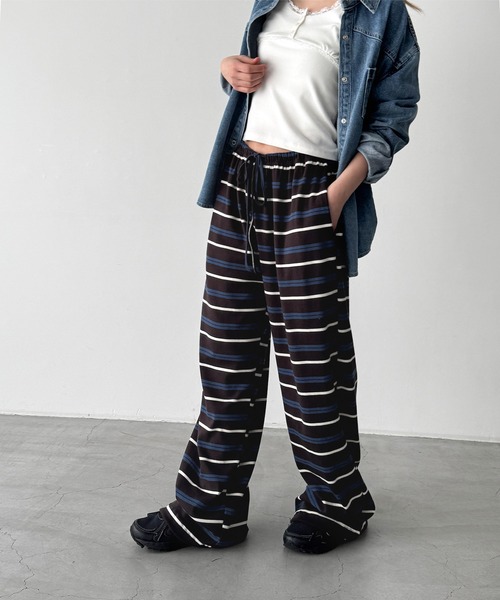デザイン コーディネートの主役になるマルチボーダー柄のイージーパンツ。 リラックス感のあるワイドシルエットで、ウエストはゴム&紐仕様なのでストレスフリーです。 素材 程よい厚みと柔らかさがあり、おうち時間からお出かけまでロングシーズン快適に過ごせます。 コーディネート パンツが主役なので、トップスはシンプルなTシャツやタンクトップを合わせるだけで◎ 裾にはドローコードが付いているので、そのままストンと穿くのはもちろん、絞ってシルエットにメリハリをつけて穿くのもおすすめです。 ------------------------------------- 生地の厚さ:厚い〇〇●〇〇薄い 伸縮性:あり 透け感:なし(アイボリーややあり) 裏地:なし 光沢:なし ・2ポケット ・ウエストゴム仕様(ドローコード付き) ・裾ドローコード付き ------------------------------------- 取扱い ・蛍光増白剤が入っていない洗剤をご使用ください。 ・クリーニングネットをご使用ください。 ・濃い色と白 ・淡色物は分けて洗ってください。 ・洗濯で多少縮むことがあります。洗濯後はすばやく形を整えて干してください。タンブラー乾燥はお避けください。 ・アイロンの際は当て布をご使用ください。 ・着用時の汗や摩擦により、他の衣類や鞄などに色移りすることがありますので、淡色系との着合わせはご注意ください。 ・摩擦や引っかけにご留意ください。 ※取り扱い及びお手入れ方法については、商品についている取扱表示、洗濯表示にてご確認下さい。 ※照明の関係により、実際よりも色味が違って見える場合があります。またパソコン・スマートフォンなどの環境により、若干製品と画像のカラーが異なる場合もございます。 ※商品の色味は、商品アップ画像をご参照ください。