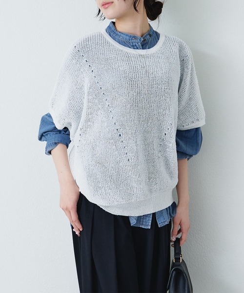 ピュアルセシン 2026 SS collection 【HOLISTETIQUE ACTIVE LUXURY】 ◇アイレットデザインがさり気ないアクセント◎シーズンムード高まるサマーニット◇ ●商品のお気に入り登録 クーポンやタイムセール、再入荷通知やラスト1点などお得な情報を受け取ることができます。 ご登録をお忘れなく◎ ●デザイン 立体的なテープヤーンで編み立てた涼やかなサマーニット。 ざっくりとしたローゲージの透け感とふわっとしたルーズなシルエットが、抜け感のあるアイテムに。 さり気なく縦ラインを意識するアイレットデザインは細見え効果も期待できます。 レイヤードするアイテムと馴染みやすい身頃と袖口が一体となったこだわりのシームレスデザイン◎ 裾は太めのリブ仕様で仕上げ、ラフな雰囲気を引き締めメリハリが生まれます。 程良い透け感がヘルシーな1枚です。 ●スタイリング スクエアタンクをインナーにヘルシーな肌見せはもちろん、 キャミワンピやサロペットなどと合わせ涼やかなコーディネートに。 ナロースカートやスラックスパンツあわせでキレイめカジュアルなスタイリングや、 カーゴパンツやスウェット合わせでマニッシュな雰囲気など着回しをお楽しみいただけます。 シンプルなトップスなので、存在感のあるネックレスやチョーカーで 首元にアクセントをつけるのもオススメです。 ●素材 平たくテープのような形の糸を使用し7G(ゲージ)で編まれたニット素材。 =============================== 洗濯方法:手洗い/ウェットクリーニング/ドライクリーニング 透け感:あり 裏地:なし 伸縮性:あり 光沢感:なし 生地の厚さ:薄手 【スタッフコメント】 年齢:20代前半/身長:153cm/普段着用サイズ:S~Mサイズ 着用感:ゆったりとした身幅と軽い素材感でラフな着心地。 さらりと着用でき通気性も抜群なので、気温の高い日もお洒落を楽しみながら快適に過ごせそうです。 =============================== ※着用、お取り扱いの際は、商品についている品質表示とアテンションタグを必ずご確認下さい。 ※撮影場所やお使いのモニター環境により若干お色味が異なる場合がございます。特にロケの撮影では明るく見える傾向にございます。 ※予約商品はサンプルで撮影をしております。若干の仕様が変更になる場合がございますので予めご了承の上ご注文くださいますようお願いいたします。 【予約品の入荷時期について】 店舗入荷時期と予約商品のお届け時期が異なる場合がございますので、予めご了承ください