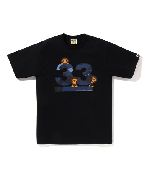 33年にわたり紡いできたブランドの軌跡を落とし込んだ、記念ナンバリングデザインのTシャツが登場。 コットン天竺を使用した着心地の良い、ショートスリーブTシャツ。 フロントに33周年ならではのCOLOR CAMO柄の「33」とBABY MILO モチーフ、バックにAPE HEAD グラフィックをラバープリントしたデザイン。 レギュラーフィットシルエットで、インナーからメイン使いまで幅広く活躍する一着。