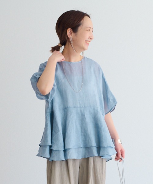 ピュアルセシン 2026 SS collection 【EFFORTLESS LUXE】 【@sein___000企画】 ◇1枚でコーディネートが決まる女性らしいペプラムブラウス◇ ●商品のお気に入り登録 クーポンやタイムセール、再入荷通知やラスト1点などお得な情報を受け取ることができます。 ご登録をお忘れなく◎ ●デザイン 上品なシアー感と2段重ねのペプラムが軽やかな印象のブラウス。 昨年人気だったサックスブルーにキャメルとグレーの新色を加え登場です。 ヒップ回りまで覆う着丈で、気になる部分が隠れ、 ゆったりとした身幅や広い袖口は、窮屈感なく着用いただけます。 涼やかなシアー素材とペプラムデザインで、風や動きに合わせて 柔らかになびき女性らしさが溢れます。 ウエストから裾に向かって広がるペプラムが2段なことでよりフェミニンに。 シンプルなデザインながら、バックはリボンで可愛らしさをプラス。 1枚でコーディネートが決まるアイテムです。 ●スタイリング デニムと合わせて定番コーディネートや、 スラックスと合わせてキレイ目なコーディネートがバランスよく着用いただけます。 ●素材 さらりとした肌当りで、柔らかなリネンのシアー素材です。 =============================== 洗濯方法:手洗い/蛍光増白剤入りの洗剤は使用しないでください/タンブラー感想は避けて下さい 透け感:ややあり 裏地:なし 伸縮性:なし 光沢感:なし 生地の厚さ:やや薄手 【スタッフコメント】 年齢:20代前半/身長:153cm/普段着用サイズ:S~Mサイズ 着用感:シアー素材とウエストから裾に向かって広がるデザインが ふんわりとしたシルエットで着用できました。 袖口が広くとられているので、腕が動かしやすかったです。 =============================== ※着用、お取り扱いの際は、商品についている品質表示とアテンションタグを必ずご確認下さい。 ※撮影場所やお使いのモニター環境により若干お色味が異なる場合がございます。特にロケの撮影では明るく見える傾向にございます。 ※予約商品はサンプルで撮影をしております。若干の仕様が変更になる場合がございますので予めご了承の上ご注文くださいますようお願いいたします。 【予約品の入荷時期について】 店舗入荷時期と予約商品のお届け時期が異なる場合がございますので、予めご了承ください