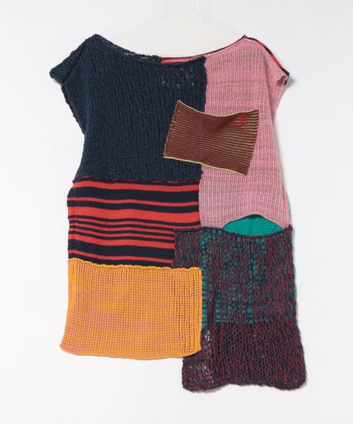 様々なカラーブロックやテクスチャーの異なる編地を大胆に組み合わせたクラフト感が楽しいニットトップ。シンプルな長方形のシェイプながら、主役級の存在感の一枚。左胸にラフに付いたブラウンのパッチはさりげなくポケットになっており、所々ホールが開いていたりと遊び心満載のカーディガンです。※左胸のポケット、向かって右上にステッチORB刺繍が入ります。