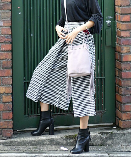 アンバランスタックの格上げデザイン!シンプルカットソーとコーデするだけで 即トレンドスタイルに返信!後ろウエストにはゴム入りで履き心地もらくらく◎ モデルさんみたいにアンクルブーツとのコーデがおすすめ♪