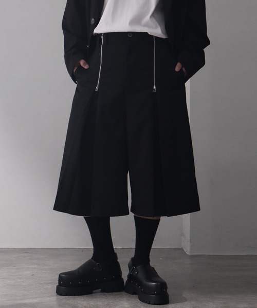 welise2026 Spring/Summer-Intuition Sense- スタイリングに映えるジップディテールがモード感全開な、今夏新型のハーフスラックス。 ◆デザイン/シルエット◆ デザイン性の高いハーフスラックスが完成。なんといっても特徴はフロントウエストに施されたジップデザインで、一目でアクセントになるモードな雰囲気を演出。 ジッパーの上げ下げでまた違った表情やシルエットに変化します。 しっかり生地用尺を使ったワイドバギーなシルエットにハーフパンツとしては長めな膝下丈で、リラックス感がありつつも洗練された印象に。動きに合わせて生まれる生地のドレープ感が、モードなスタイルを引き立てます。 ◆素材◆生地からオリジナルで開発したハイグレードTR素材を使用。しなやかで滑らかなタッチと、上品な表面感が特徴です。 400gのヘビーウェイトに設定することで、適度な肉感と美しいシルエットをキープ。とろみのあるドレープ感はそのままに、柔らかさを損なわない仕上がりとなっています。 同素材シリーズとして展開している注目のファブリックです。 ◆コーディネート◆コンパクトなトップスやショート丈アイテムと合わせることで、シルエットのメリハリを活かしたスタイリングがおすすめ。Tシャツやシャツと合わせるだけで、ディテールが映えるスタイルが完成します。足元はブーツやボリュームスニーカーと好相性。モードからカジュアルまで幅広く対応できる、着回し力の高い一本です。 ※ATTENTION※ ・撮影場所やライティング、お使いのモニター環境によって色の見え方が異なる場合がございます。 -welise/ウェライズ- ブランド名はwell(良い)+Rise(上昇)を組み合わせた造語になります。 洋服の持つ本来の美しさを最大限に引き出したハイエンドな素材感にこだわりながら 常にアップデートしていくシルエット・デザイン性も追求。