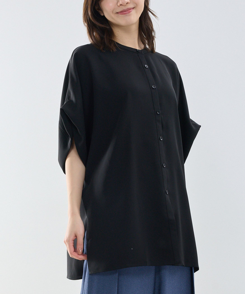2025SSをブラッシュアップしたシリーズから、テントラインが魅力的なブラウスが登場。昨シーズンと同様の生地を使用し、とろみのあるしなやかな風合いを楽しめるデザインに仕上げました。バンドカラーのデザインがすっきりとした首元を演出します。程よく落ち感のあるボリュームとサイドスリットが軽やかな印象をプラス。ワイドパンツと合わせれば、大人のリラックススタイルを楽しめるアイテムです。 ・ホワイト透け感あり ・ストレッチなし ・カラー展開はホワイト、ブラック、ブラウン、ピンク ・サイズ展開は1(M)9号・3(2L)13号