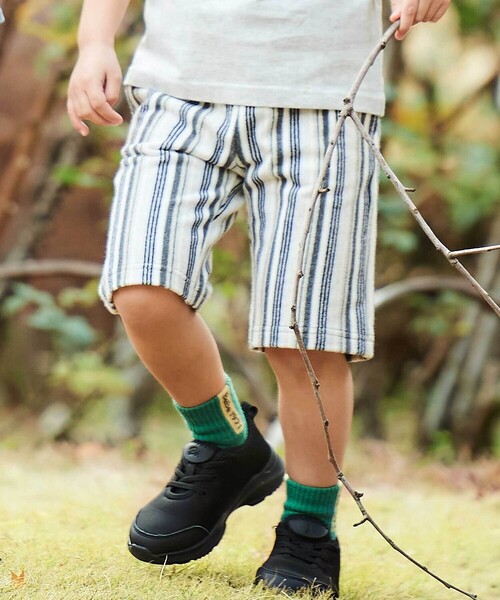 -26SS- ふんわりとした柔らかな肌触りのパイル生地を使用したハーフパンツ。 ■デザイン 太さのまばらなストライプの柄がメンズライクでかっこいい。 部分的にムラ感のある糸を使用してモノトーンの中に、にじみ感があるのもおしゃれです。 モノトーンの合わせやすさもありつつ、印象的な柄はコーデのポイント使いにぴったり。 合わせるTシャツのデザインでシックにもカジュアルにも着こなせます。 ■素材/機能 表面はパイルの織り、裏面は天竺の織りになったダブルフェイスのパイル生地。 空気を含んだ程よい肉感のあるカットソーです。 ※柄の出方は生地の裁断により一点一点異なります。 ※両脇・おしりポケットあり。 ※ウエスト裏にゴム調節口あり。 26春夏 男の子アイテム 【4月 BOY】 - 森の秘密基地 - 緑豊かなヴァンセンヌの森でサマーキャンプ! 森を散策したり、生き物を観察したり、自然の中を探検しよう。 機能性のあるデティールを取り入れたアクティブなカジュアルコーデ。 【2026年春夏 シーズンテーマ】 -今日は何しよう?- トラッドでベーシックなアイテムやスタイリングに、軽やかな素材づかいやクリーンな発色とクラフト感あるディティールづかいで楽しさをプラス。 「今日は何しよう?」のわくわくした気持ちをファッションを通して表現します。 【BeBe(べべ)】 ”LOVE MODERN” 少しおませで、生意気なヨーロピアンカジュアルの提案。 時代性・流行性をとらえ、ベーシックでもワンポイントを施した遊び心、楽しさを盛り込んでいます。 シンプルだけど、こだわりのあるオリジナリティーを重視しています。