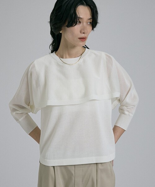 *Detail*ノースリーブタンクにシアーケープ袖を重ねた、軽やかなレイヤードデザイン。気になる二の腕を自然にカバーしながら、抜け感のある上品な印象に。袖丈は短すぎず、安心感のあるバランスに仕上げました。*Coordinate*ワイドパンツと合わせて、リラックス感のあるきれいめスタイルに。シンプルなボトムでもデザイン性が映え、1枚で着映えが叶います。小物はレザー調バッグやサンダルでまとめて、大人の洗練感をプラスして。