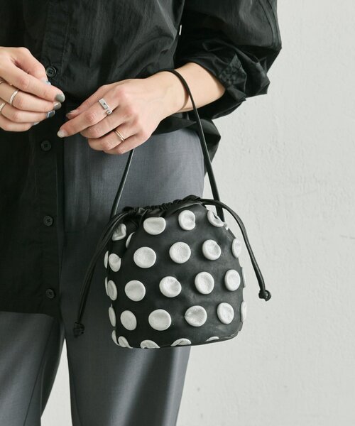 putsu putsu 【ぽこぽことしたドットが躍る、モダンな巾着ポシェット】 立体的な水玉模様が、装いにリズムと奥行きをもたらす巾着型の2WAYバッグ。 上質なレザーに施された特殊加工のドットが、平面的な素材にはないグラフィカルな陰影を生み出しています。 コロンとした円形の底から立ち上がる、愛らしくもモードなシルエット。 シンプルなスタイリングに一点投入するだけで、アーティスティックな感性が光る主役級のアイテムです。 【遊び心あふれる立体加工と丸いフォルム】 思わず指先で触れたくなるような、ポコポコとした水玉の心地よい質感。 口元をキュッと絞ることで生まれる柔らかなレザーのドレープと、整然と並ぶドットの凹凸が絶妙なコントラストを描きます。 黒とシルバーのコントラストが、大人の可愛らしさと洗練された格好良さを両立。 手に取るたびに心が弾む、アートピースのような佇まいが魅力です。 【自由度を高める2WAY仕様と円形底の機能美】 ストラップの付け替えで軽快な「斜め掛け」と、上品な「手持ち」の2スタイルを自在に。 コンパクトなサイズ感ながら、円形の底マチを広く取ることで見た目以上の収納力を確保。 開口部はドローストリング(巾着)仕様で、荷物の出し入れもスムーズ。 デイリーからお出かけまで、日常のフットワークを軽く、かつエレガントに彩ります。 【伝統技法が生み出す「水玉立体加工」】 本体には、京都・洛北にて友禅の伝統技法を応用した「京手捺染(きょうてなせん)」を施しています。 特殊な薬品で革を縮ませ、蒸し工程を経てぷっくりと浮かび上がらせた水玉模様は、職人が一枚一枚丁寧に加工した手仕事の証です。 独特の立体感と柔らかな表情を併せ持ち、他にはない圧倒的な存在感と心地よい手触りを実感いただけます。 【kawa-kawa(カワカワ)】 自然なようで凝っている 端正なのにくずれている? バカバカしいけどかわいらしい 男っぽくて女らしい 正統派だけど画期的 いい加減ではなく良い加減 日本製、素材とデザインにデザイナーの拘りが詰まったハンドメイドバッグブランド。 《お気に入り登録》でお得な情報がいっぱい! ・「商品のお気に入り登録」で入荷情報や、ラストの通知、セール・クーポンの通知などを受け取ることができます! ・「ブランドのお気に入り登録」で新商品や再入荷など、お得な情報を受け取ることができます!