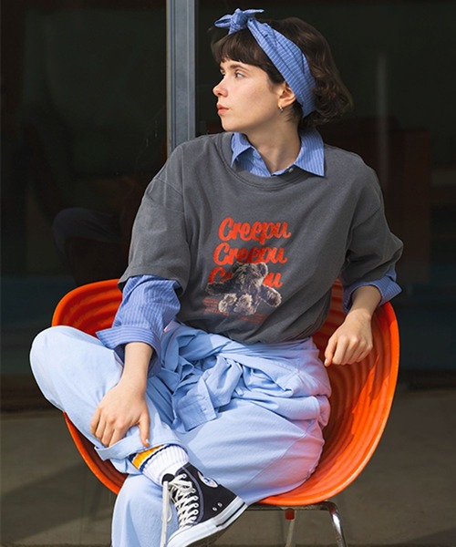 studio CLIPオリジナルキャラクターのアイテムが登場! キャッチーで可愛らしい半袖Tシャツ ーーー 【素材】 柔らかくサラリとした質感が特徴の素材を使用。 着心地の良さも特徴です。 【デザイン】 studio CLIPオリジナルキャラクターの『Creepu』とロゴをヴィンテージ風にプリントしたキャッチーな一枚。 フロントのプリントがコーデのアクセントに◎ FREEサイズとBIGサイズの2サイズ展開で、サイズ感を選べるのも嬉しいポイントです。 ーーー 【スタイリング】 デニムパンツやカーゴパンツ合わせのカジュアルな着こなしや、フレアスカートやナロースカート合わせの女性らしい着こなしもおすすめ。 ベストやインナーをレイヤードしたトレンド感のあるスタイリングも素敵です。 【BIGサイズについて】 ゆったり着たい方に向けたオーバーなサイズ感です。