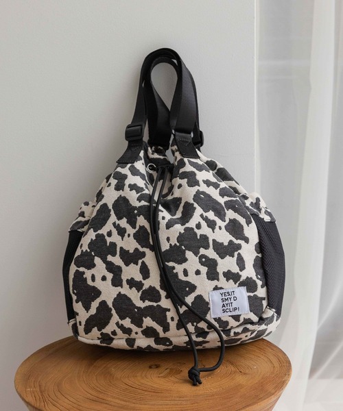 トートもショルダーも、自分好みに調整可能! サイドファスナーで荷物へ簡単アクセスできる万能バッグ ーーー 【素材】 軽くて丈夫なポリエステル素材を使用しています。 【デザイン】 トートバッグにもショルダーバッグになる便利な2WAY仕様。 トートハンドル・ショルダーベルト共に長さ調節が可能で手持ち、肩掛け、斜め掛けと、その日の服装や体格に合わせてベストなバランスで持ち運べます。 メインポケット貫通サイドファスナーを付け、巾着を絞った状態でもメイン収納の荷物をスムーズに出し入れできます。 ーーー サイドにはスマートフォンなどの収納に便利なメッシュポケットを配置し、使いやすさにもこだわったデザインです。 ペットボトルや長財布が無理なく収まるサイズ感です。 【スタイリング】 カジュアルなデニムスタイルにはもちろん、きれいめなコートやワンピースにカウ柄を合わせて遊び心をプラスするコーディネートおすすめです。 通勤、通学からデイリーユースまで幅広いシーンに活躍します。