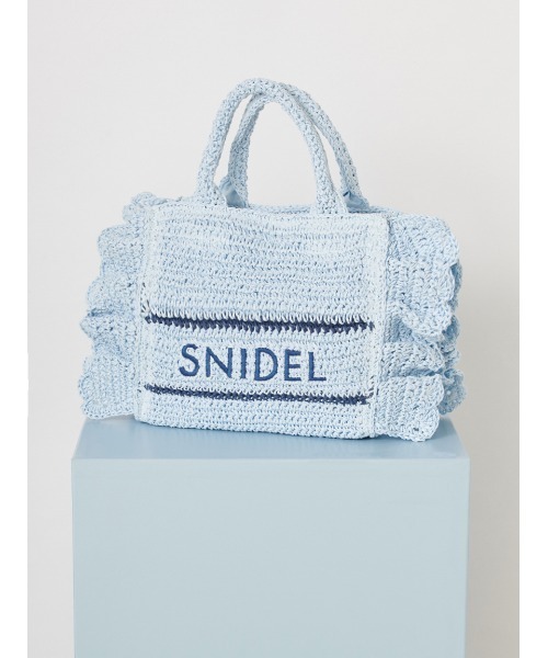 【春夏スタイリングを盛り上げるトレンド感たっぷりのブレーズフリルロゴショルダーバッグ】 【Design/Styling】 定番人気のSNIDELロゴ刺繍入りの華やかなフリルバッグに、春夏シーズンにぴったりな天然素材の柄編みバッグが登場。 こちらはミニバッグ(SWGB261651)より大きめのサイズ感でお作りしており、タンブラーやポーチなどがたっぷりと入ります。 軽やかで涼やかな素材感で、スタイリングを華やかに彩って。 底板を入れているのでしっかりと形状をキープします。 SNIDELロゴは、ネイビーカラーで大きめに刺繍を施し、今季らしいマリンテイストに仕上げました。 付属の長さ調節が可能な細レザーストラップを装着すればショルダーにもできる便利な2WAYデザインです。 開口部はマグネット仕様で中が見えにくく、開けると大きく開口部が開くので整理整頓も楽ちんです。 内側にはカード類が収納できるポケットが付いています。 ホワイト、ベージュ、ライトブルーの3色展開。 ※照明の関係により、実際よりも色味が違って見える場合があります。 またパソコン・スマートフォンなどの環境により、若干製品と画像のカラーが異なる場合もございます。予めご了承ください。 商品の色味は、商品単品画像をご参照下さい。 ※商品画像はサンプルのため、色味やサイズ等の仕様に変更がある場合がございますので、予めご了承ください。