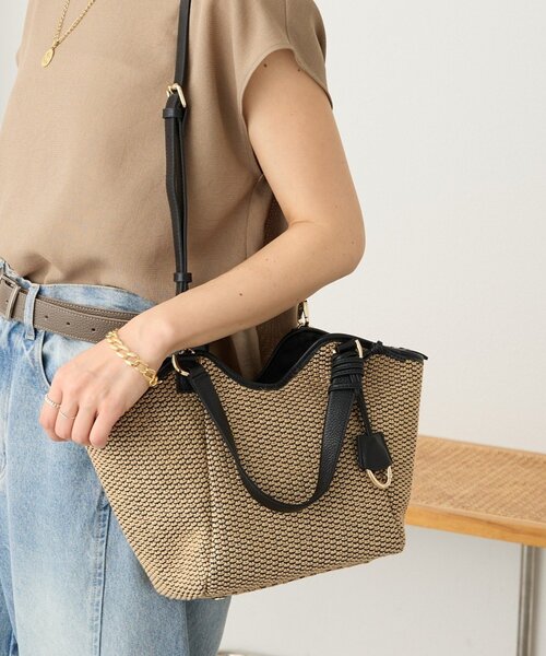 見た目軽やかなコンパクトなかごバッグ ●デザイン ・ラフィア風のシートを使用した軽やかな見た目のトートバッグ。 ・レザーのパイピングがアクセントに。 ・曲線的なトートバッグデザインで上品な佇まい。 ・ラフな印象になりすぎず、きれいめからカジュアルまで幅広いスタイリングにマッチ。 ・メインの収納部分にはファスナー付きで安心感あり。 ・メインの収納部分以外にも口部分にあおりポケットがあるため荷物を分けて収納いただけます。 ・取り外し可能なショルダーストラップ付き。 ・カラビナチャーム付き。ワンポイントアクセントに。 ▼ATTENTION▼ ●この製品は素材の性質上繰り返しの摩擦により素材表面に毛羽が発生することがあります のでご注意ください。 ●摩擦(特に湿った状態での摩擦)の汗や雨などで濡れた時は他の物に色移りする場合があり ます。(特に白物) (天然皮革使用製品のご注意) この製品はデザインを重視した天然皮革を部分使いしています。 摩擦、雨などで色移りする可能性があります。 上記の点をご留意の上、この製品をお楽しみください ●サイズ 幅:41(底:21)×高さ:24.5(本体中心19)×マチ:11㎝ 持ち手:35㎝ ショルダー:86~102cm ファスナー開閉 カラビナーチャーム付 あおりポケット×1 内オープンポケット×1 ●素材 ポリエチレン ポリプロピレン 付属:牛革 -------------------------------------------------------------------------------- 【お買い物をもっと便利に楽しく♪】 『♡』をクリックでお気に入り登録 ✓「商品のお気に入り登録」で・・・ ラスト1点や再入荷の通知が届きます。登録して頂いた商品だけが対象となる、あなただけのタイムセールが開催されることも! ✓「ブランドのお気に入り登録」で・・・ 新商品や再入荷など、いち早くブランドのお得な情報を 受け取ることができますので、ご登録をおすすめします! -------------------------------------------------------------------------------- 【注意点】 ※画像の商品は光の照射や角度、お使いのモニター環境により、 実物と色味が異なる場合がございます。 ※入荷状況により、お届け予定が前後する場合があります。 ※お客様への発送が店頭販売より遅れる場合もあります。 ※追加生産商品は、一部の店舗、通販で販売中の場合がございます。 予めご了承下さい。 ----------------------------------------------------------------------