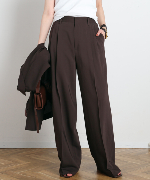軽めのレーヨン生地で夏も涼しく穿けるワイドパンツ。 イタリアのインポート素材特有の上品な落ち感とさらっとした肌触り、マットで落ち感があるのでワイドシルエットもすっきり見えます。 裏地がないので夏場も涼しく着ていただけます。 同じ生地で仕立てたジャケットと合わせたセットアップスタイルもおすすめです。 ベーシックで幅広いシーンで重宝するブラックと、今年らしくモダンなこっくりしたブラウンの2色展開でご用意しました。 ※セットアップ対応 26010586101010_Sleek Jacket_57,200円(税込) ※照明の関係により、実際よりも色味が違って見える場合があります。 またパソコン・スマートフォンなどの環境により、若干製品と画像のカラーが異なる場合もございます。 ※商品の色味は、商品アップ画像をご参照ください。 本体:ドライクリーニング