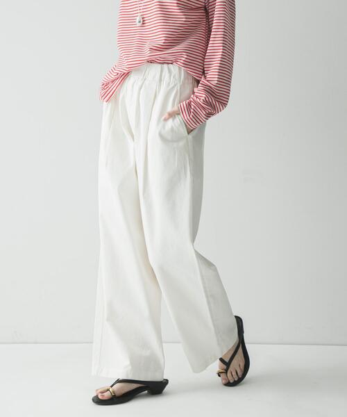 ヴィンテージライクな表情と快適な穿き心地を両立した、チノイージーパンツ。 綿100%の強撚風糸を使用し、柔らかくドライタッチな質感に仕上げました。 特有の色ムラや加工感を施すことで、ビンテージライクなこなれ感のある表情を演出。春夏シーズンを通してさらりと快適に着用いただけます。 ウエストは総ゴムのギャザー仕様でリラクシーな穿き心地ながら、フロントはファスナー開きにすることで、トップスをインした際もすっきりと上品に決まるデザインに。内側の紐でサイズ調整も可能です。 また、 3サイズ展開なので低身長の方から高身長の方までジャストサイズをお選びいただけます。 ゆとりのあるワイドシルエットながら、腰回りのボリュームを抑えた計算されたパターンにより、着膨れせずスマートな着こなしを叶えます。 POINT ・肌離れが良く、柔らかいタッチの綿100%ドライチノ素材 ・リラックス感のあるウエストゴム仕様と、サイズ調整可能な内紐付き ・低身長から高身長の方まで理想の丈が選べる、3サイズ展開 【2026 Spring/Summer】【26SS】 ※この商品は、縫製後水洗い(製品洗い)を行い、独特のシワ加工をしてあります。 ※素材の特性上、洗濯をすると多少色あせや風合い変化をする場合があります。 ※その他お取り扱いに関しましては、商品に付属のアテンションタグをご覧ください。 ※商品画像は、光の当たり具合やパソコンなどの閲覧環境により、実際の色味と異なって見える場合がございます。予めご了承ください。 ※商品の色味の目安は、商品単体の画像をご参照ください。 ▼お気に入り登録のおすすめ▼ お気に入り登録された商品は、マイページにて現在の価格情報や在庫状況の確認が可能です。 お買い物リストの管理にぜひご利用ください。 素材感 透け感 : ややあり(OFF WHITEのみ) 伸縮性 : なし 裏地 : なし 光沢 : なし ポケット : あり 403638
