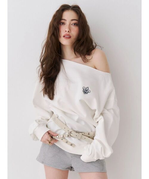 ワンショルダーデザインが目を惹くスウェットトップスです。 胸元にはオリジナルのワンポイントを施し、さりげないアクセントをプラス。 裾幅を絞った仕様で腰位置に留まり ボリューム感のあるシルエットがポイントです。 小柄な方はワンピース風の着用や ベルトを重ね合わせたトレンド感のあるスタイリングもおすすめです。
