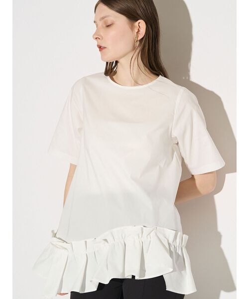 FRILL HEM BL 程よくボリュームのある裾フリルが華やかさをプラスしてくれる半袖ブラウス。 ハリのある別素材を使ってフリルをアシンメトリーに配置。 肩回りは少しコンパクトに仕上げ、裾フリルのボリューム感を引き立たせたメリハリのあるバランスが◎。 肘丈のハーフスリーブで二の腕もカバー。 スリムパンツと合わせたメリハリのあるスタイリングがおすすめ。 ・・・・・・・・・・・・・・・・・・ 透け感:なし 裏地:なし 伸縮性:なし 生地の厚さ:普通 ・・・・・・・・・・・・・・・・・・