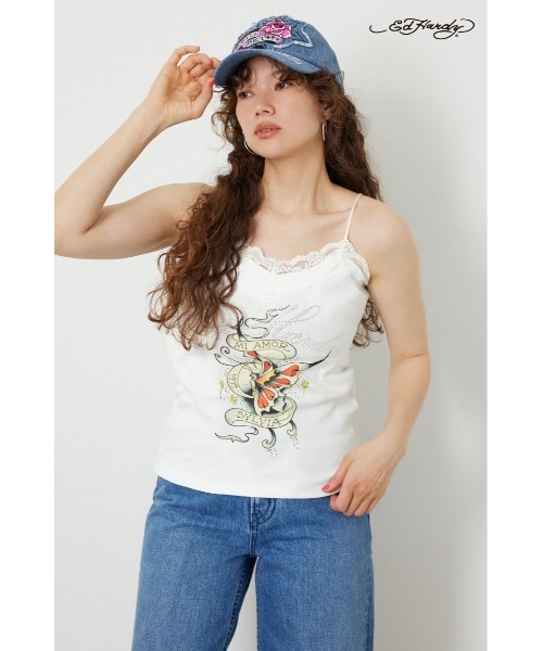 SPRING & SUMMER ( 春服 / 夏服 ) ■ポイント Ed Hardyコラボレーションアイテム。 アメリカの世界的なタトゥーアーティスト、Don Ed Hardyのアートを使用したRODEOオリジナルデザインのキャミソールです。 体に程よくフィットするフライス素材で着心地抜群。 胸元のレースと蝶々モチーフのタトゥーデザインアートがレディライクでかわいいアイテムです。 ■ディテール Ed Hardyのロゴがラインストーンで表現されており、キラキラでこだわりのあるアイテムです。 バックにはEd Hardyのフォントを使用したRODEOロゴ刺繍入り。 ■スタイリング カーゴパンツやスウェットパンツで甘辛ミックスなコーディネートにするのがおすすめです。 ジップパーカーのインナーにもぴったりです。 ■生地 柔らかな風合いのコットンフライスです。 リブ特有の伸縮性があり、また程よく厚みもあるので心地よく体にフィットします。 ■透け感:なし ■裏 地:なし ■伸縮性:あり ■光沢感:なし ※お取り扱い上のご注意 ・圧着式のラインストーンが施されています。 ・強い力をかけると取れたり、破損する恐れがあります。 ・プリントは色移りにご注意ください。 ・刺繍の引っ掛けにご注意ください。 ・レースの引っ掛けにご注意ください。 [注意事項] ※画像の商品はサンプルです。実際の商品と仕様、加工が若干異なる場合があります。 ※画像の商品は光の照射や角度、お使いのモニター環境により、実物と色味が異なる場合がございます。 ※着用、お取り扱いの際は、アテンションタグをご確認ください。 ※弊社管理上のカラーを表記しており、タグのカラー表記と異なる記載となっている場合がございます。 ※こちらの商品は、RODEO CROWNS WIDE BOWL 独自の採寸方法となっています。本サイトのサイズガイドと採寸方法が異なる場合がありますのでご了承ください。 ▼商品のお気に入り登録 お気に入りアイテムの再入荷・在庫1点などの通知を受け取ることができます。 ▼ブランドのお気に入り登録 新作アイテムの入荷や人気アイテムの再入荷、おすすめトピックスなど、いち早くブランドの情報を受け取ることができます。