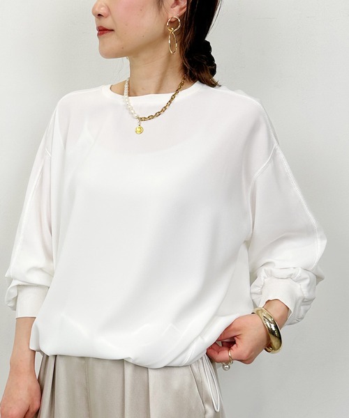 一枚でこなれスタイルが叶うドロストプルオーバー 柔らかく落ち感のあるジョーゼット生地が、体のラインを拾い過ぎず、自然に綺麗見え。 襟ぐりと袖口のリブが程よいアクセントになり、シンプルなのにどこかこなれた印象に仕上げてくれます。 ゆったりしたサイズ感と前後差のある丈で、気になる部分はさりげなくカバー。 さらに裾のドロストをきゅっと絞れば、ほんのり丸みのあるシルエットに変化。 気分やコーデに合わせて表情を変えられます。 タイトスカートで大人っぽく、ワイドパンツでリラックス感たっぷりに。 どんなスタイルにもすっと馴染む、頼れる一着です。 ※ドロスト付き 【詳細情報】 厚み:■薄手 □ふつう □厚手 透け感: ■なし □あり(オフホワイトのみ少しあり) 光沢感: ■なし □あり 伸縮性: ■なし □あり 裏地: ■なし □あり ポケット:■なし □あり 重量: 約330g ※撮影場所や明るさにより 実際の商品と色味が若干異なる場合がございます。 ☆商品のお気に入り♡登録を押せば ”再入荷通知”や”残りわずか通知” 値下げのお知らせが届きます! お気に入りのブランド登録していただければ新商品入荷のお知らせも届きますので 是非登録してみて下さい。