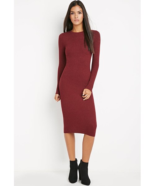 STYLE DETAILS: Forever 21 Contemporary - A ribbed knit sweater dress featuring a bodycon silhouette, midi length, and long sleeves. Crew neck, unlined 79% rayon, 11% wool, 10% nylon Hand wash cold Made in China SIZE DETAILS: Measured from Small 50.5" full length, 26" chest, 21" waist, 27.5" sleeve length
