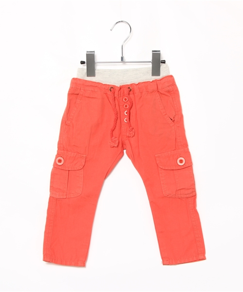 洗いをかけ、こなれた風合いが魅力のカーゴパンツ。屈んでも走っても楽ちんなウエストゴム仕様だから、一日中動きっぱなしのキッズも大満足♪着脱しやすいのも嬉しいポイント。
