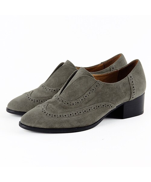 マニッシュなウイングチップデザインをヒールアップして女性らしさをプラス。細みのつま先でボリュームダウンし、スタイリッシュなシルエットに仕上げた1足。甲部分は隠れゴムが入っているのでスムーズな着脱も嬉しいポイント。