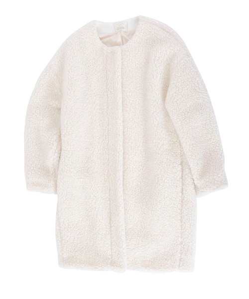 【予約販売商品】発送予定時期:11月中旬発送予定※ご予約商品は、商品入荷次第の発送となっております。発送予定時期は、商品の入荷状況により前後する場合がございます。入荷次第ご注文順のお届けとなりますので、予めご了承お願い致します。※こちらの商品は、その他の商品と同時に購入することができません。※商品画像は、サンプルでの撮影のため、色味や仕様の変更がある場合がございます。※予約商品の場合、サイズ・混率の表記がない場合がございます。また、サイズ・混率については変更になることがございますので、 予めご了承をお願い致します。ボリューミーなボアを使用したコートです。やぼったくならないように、ノーカラーで女性らしいデザインに落とし込みました。また、少し硬さのある短めのループの素材を選ぶことでより、デニムとの相性も良くカジュアルに着られます。