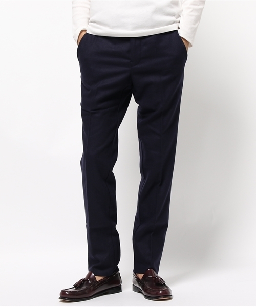 ウール混紡素材を使用しストレートスラックス。ヘリンボーン柄、無地ネイビーの2色展開。ウール混紡素材を使用していますので温かでこれからの季節大活躍しそうですね。ネイビーカラーとヘリンボーン柄がシックで落ち着いた印象。カジュアルオフィス対応としてもご着用いただけます。ジャケットを羽織ればしっかりとしたコーディネートが完成。同シリーズのジャケットとのセットアップもオススメ。