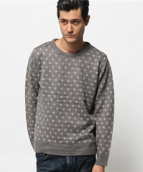 ニット長袖プルオーバー。ジャカードで入れたドット柄がポイント。カジュアルに着こなせるグレー、ベージュ、ネイビーの3色展開。ベーシックシャツとのシンプルな組み合わせがオススメ。