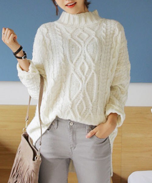 クラシックな雰囲気を演出できるボトルネックのデザイン編みニット。 ゆるめのシルエットが女性らいくかわいいフィット感です♡前後で着丈が異なるので、前だけボトムスにインして着ると脚長効果&ヒップが隠れて体型カバーにもなります◎!! ※WEARに記載してある金額と、DHOLIC通販サイトに記載してある金額にシステム都合上、稀に誤差が生じます。正しい金額はDHOLIC通販サイトに記載された金額です。